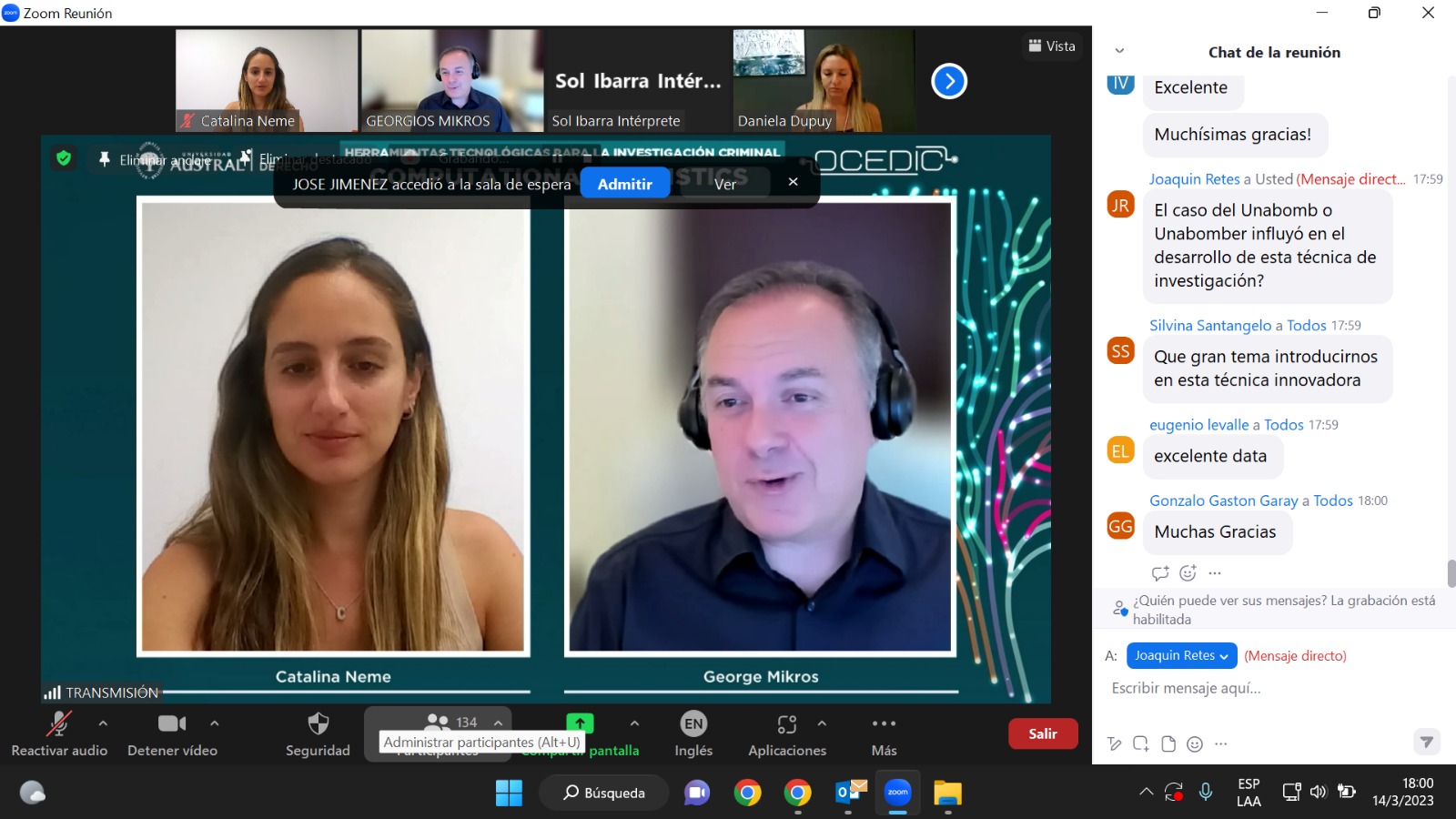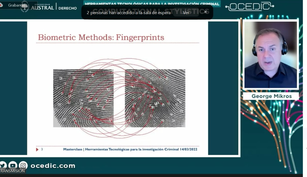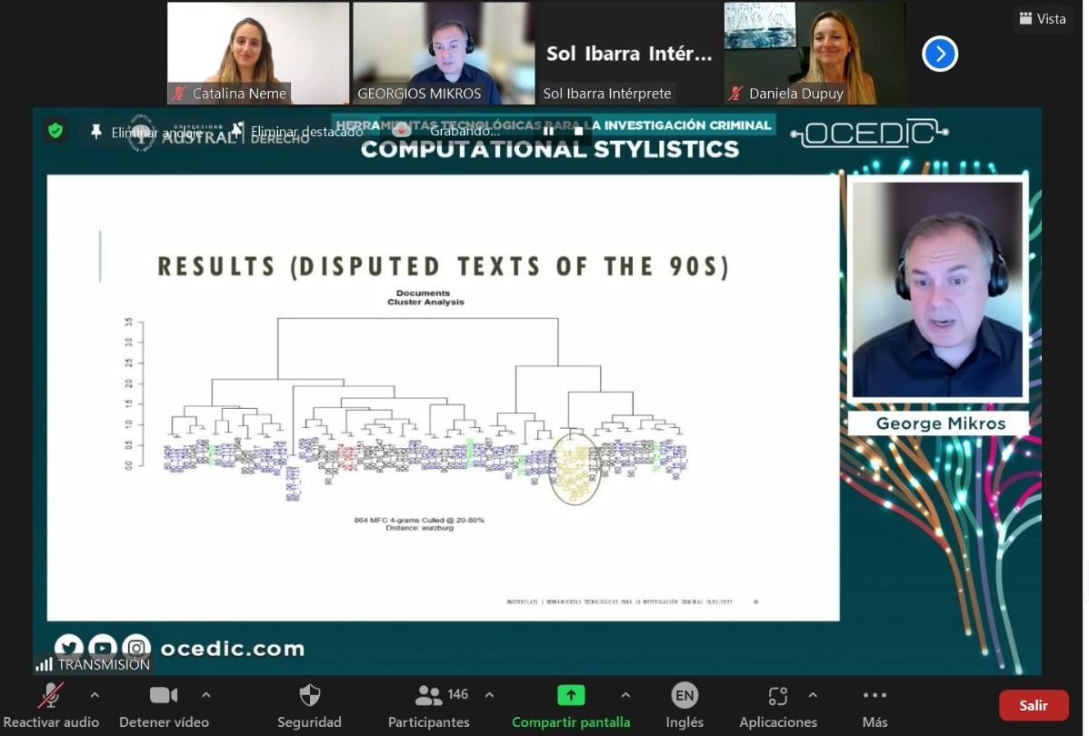 La inauguración de la conferencia estuvo a cargo de la Directora del OCEDIC, Daniela Dupuy, quien dio unas palabras de bienvenida. Luego, Catalina Neme, Subdirectora del Observatorio, presentó la ponencia de George Mikros, relativa a nuevas herramientas tecnológicas en las investigaciones criminales, profundizando en el desarrollo y uso de herramientas automatizadas para el análisis de identificación de género y detección de personalidad en textos.
